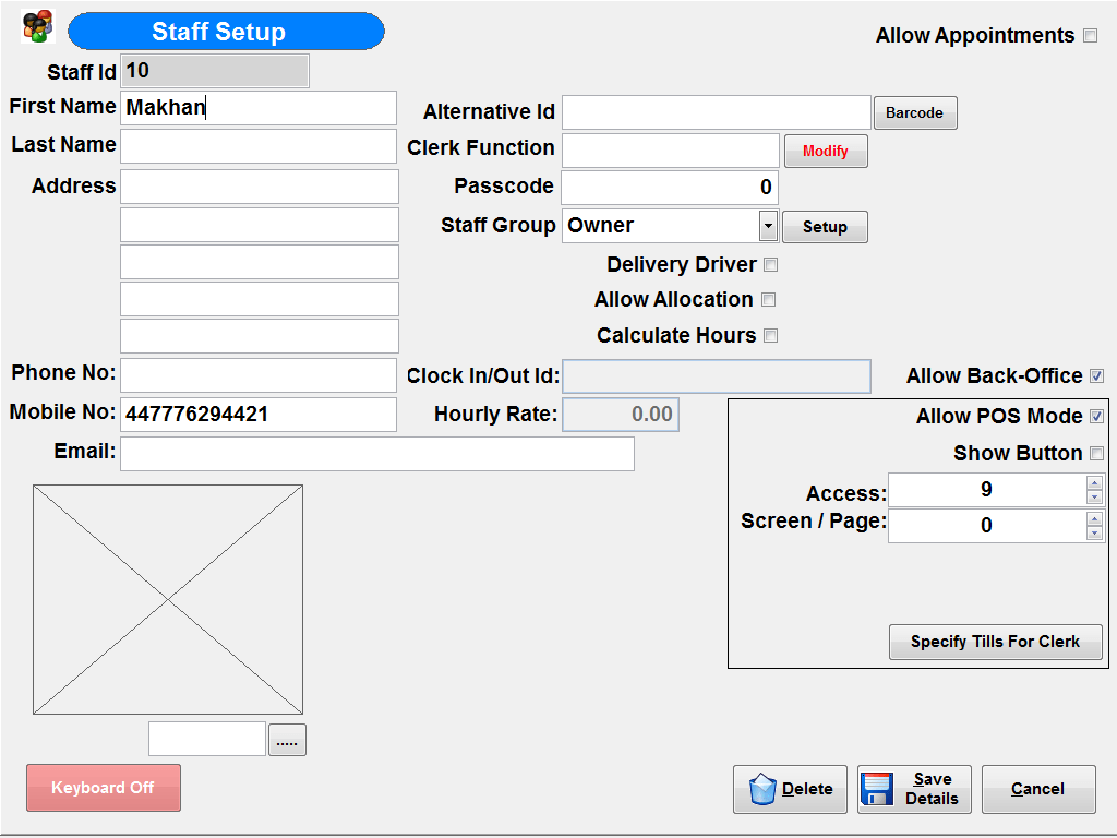 Allow POS Mode*: If Ticked staff member is allowed POS Access
